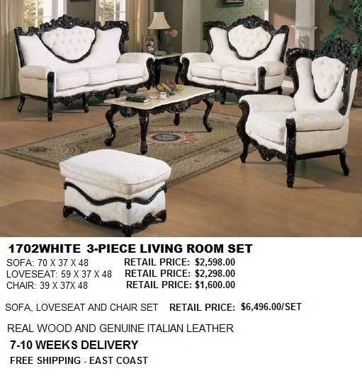 An Elegant living room set made with solid carved wood frame and genuine Italian leather. This living room set is the most Elegant renaissance furniture you can own for your beautiful home. Features Set includes: Sofa, arm chair and loveseat Carved antique frame design; Elegant living room set; Genuine italian leather; ASSEMBLY REQUIRED