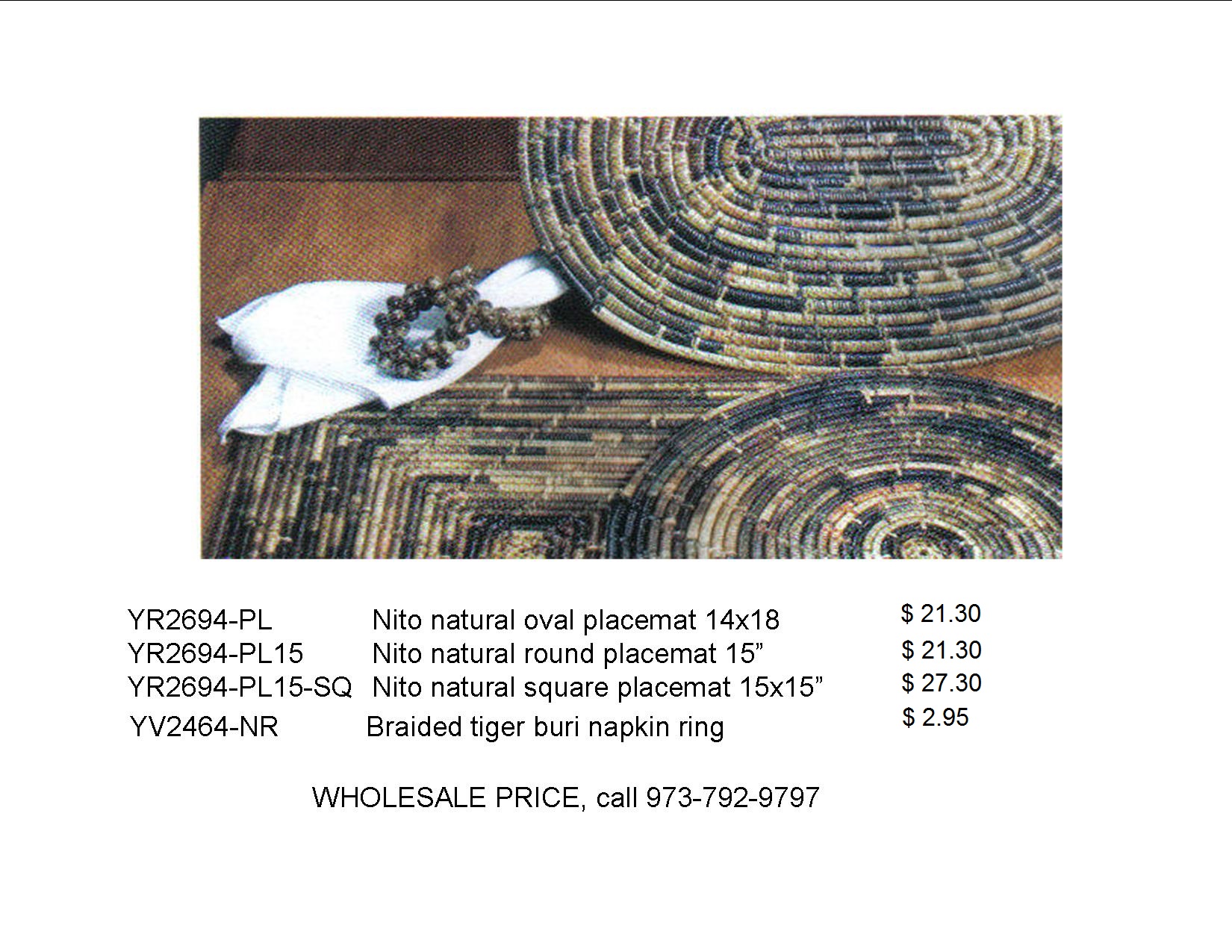 Nito Natural Placemats available in Round, Oval and Square designs and Braided Tiger Buri Napkin Ring
